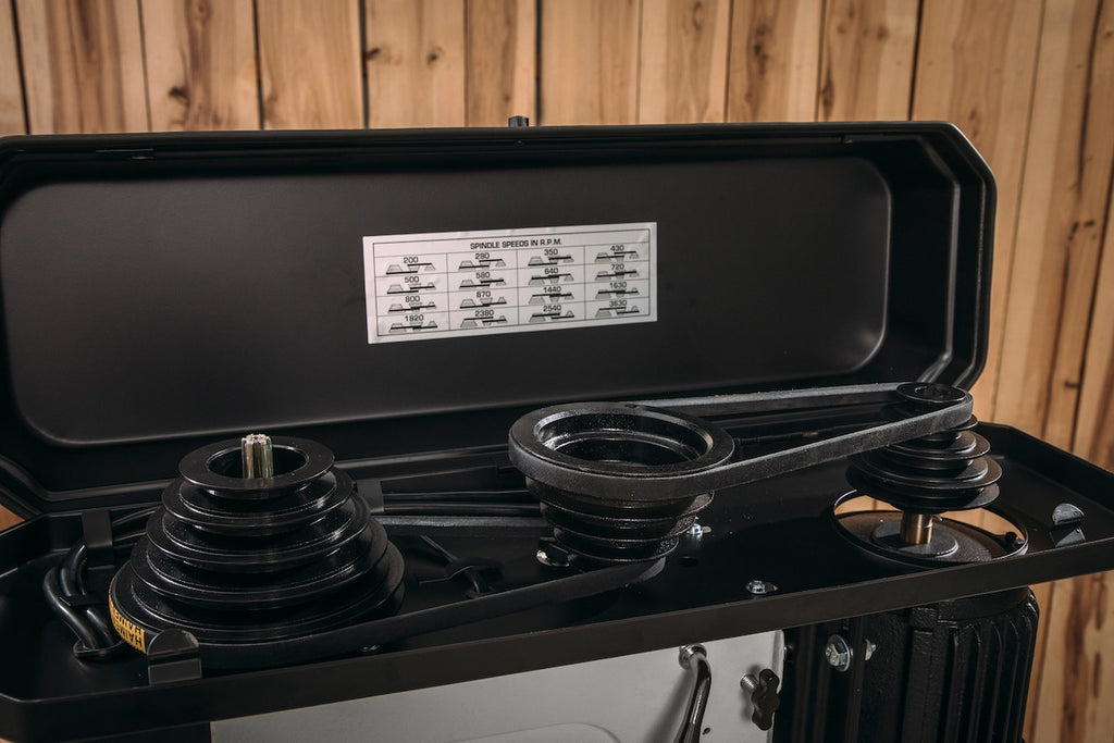 • Hinged metal belt and pulley cover provides easy access to the quick adjustment motor mount to allow rapid spindle speed changes