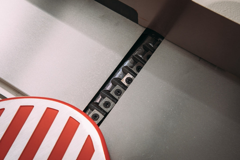 • Extra-long heavy-duty cast iron infeed and outfeed tables with precision machined finish