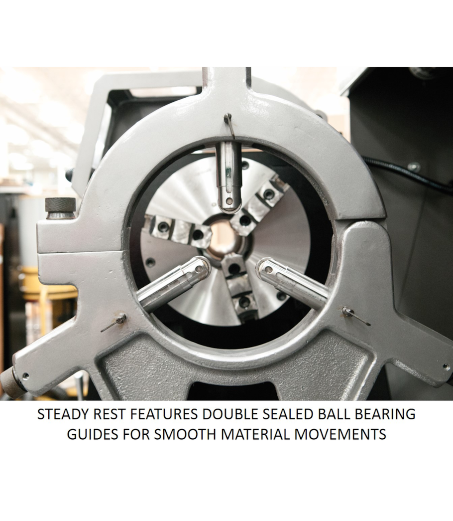 • Steady rests feature ball bearing guides for smooth material movements