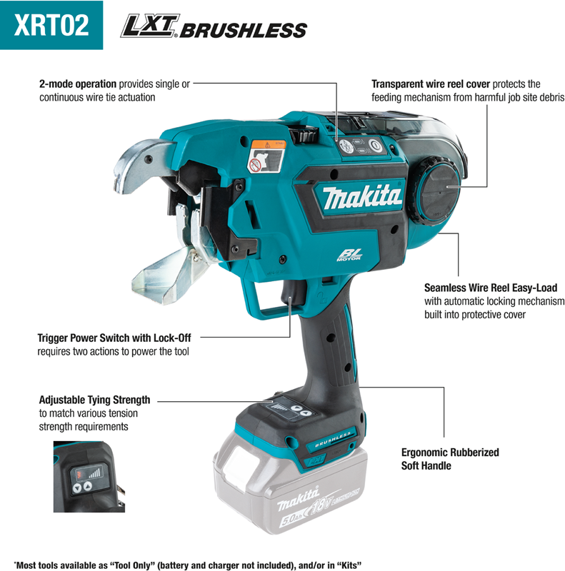 Convenience features include an ergonomic rubberized soft handle for increased comfort and a belt clip that allows the tool to remain close to the operator at all times. The trigger features a power lock-off switch that requires two actions to engage the tool. The XTR02 features a fast and seamless wire reel easy-load design with an automatic locking mechanism built into the protective cover. The Rebar Tying Tool weighs only 5.7 lbs. with an 18V LXT 5.0Ah battery installed for user comfort.